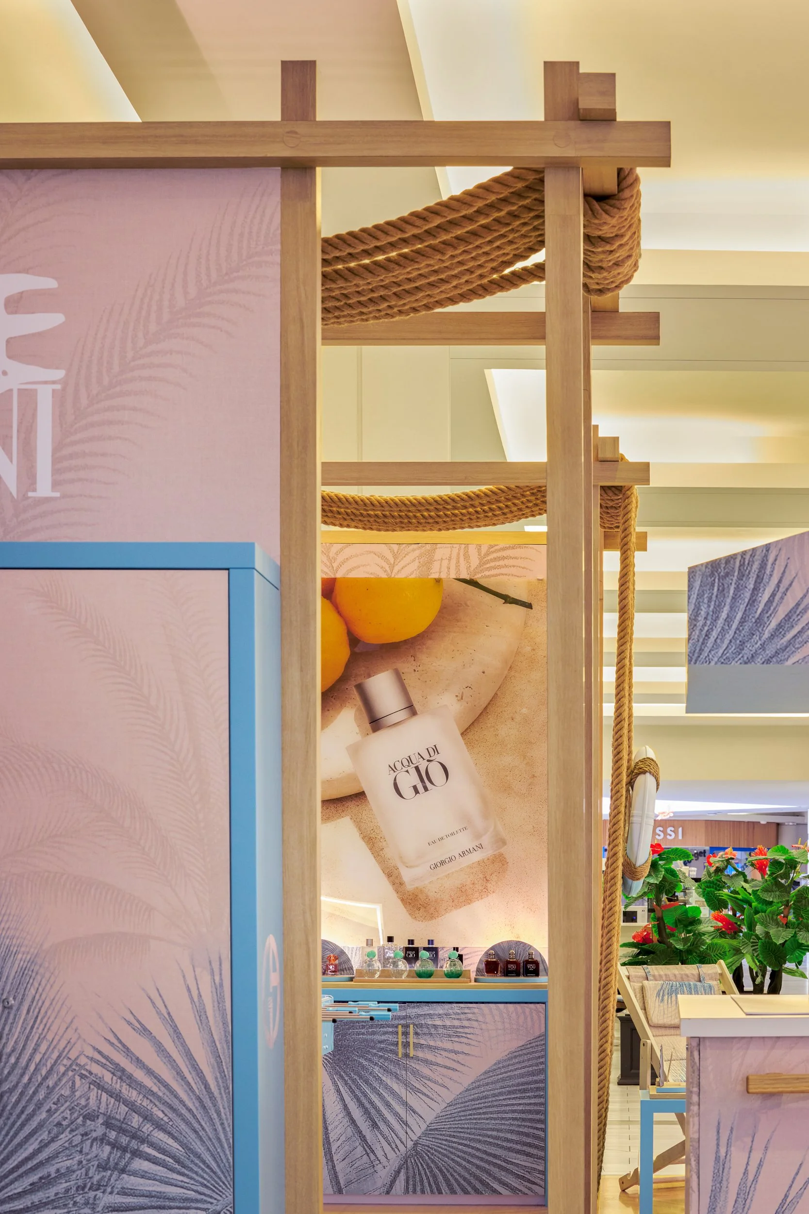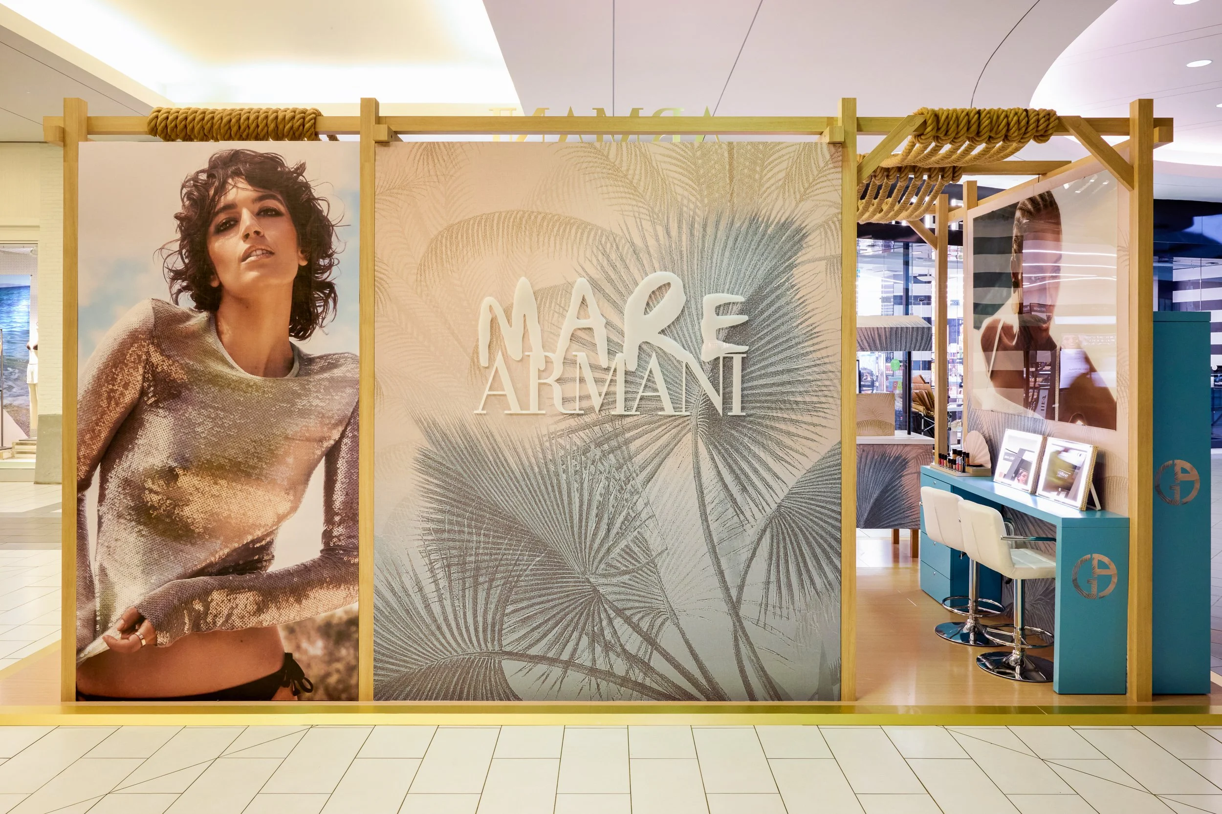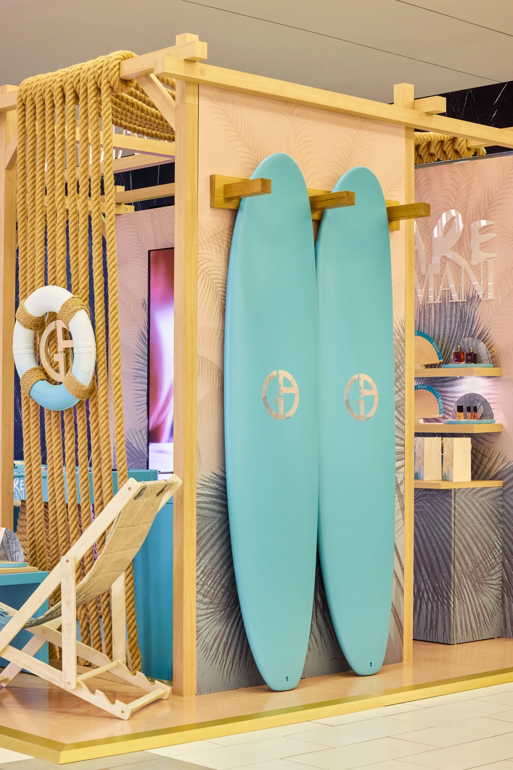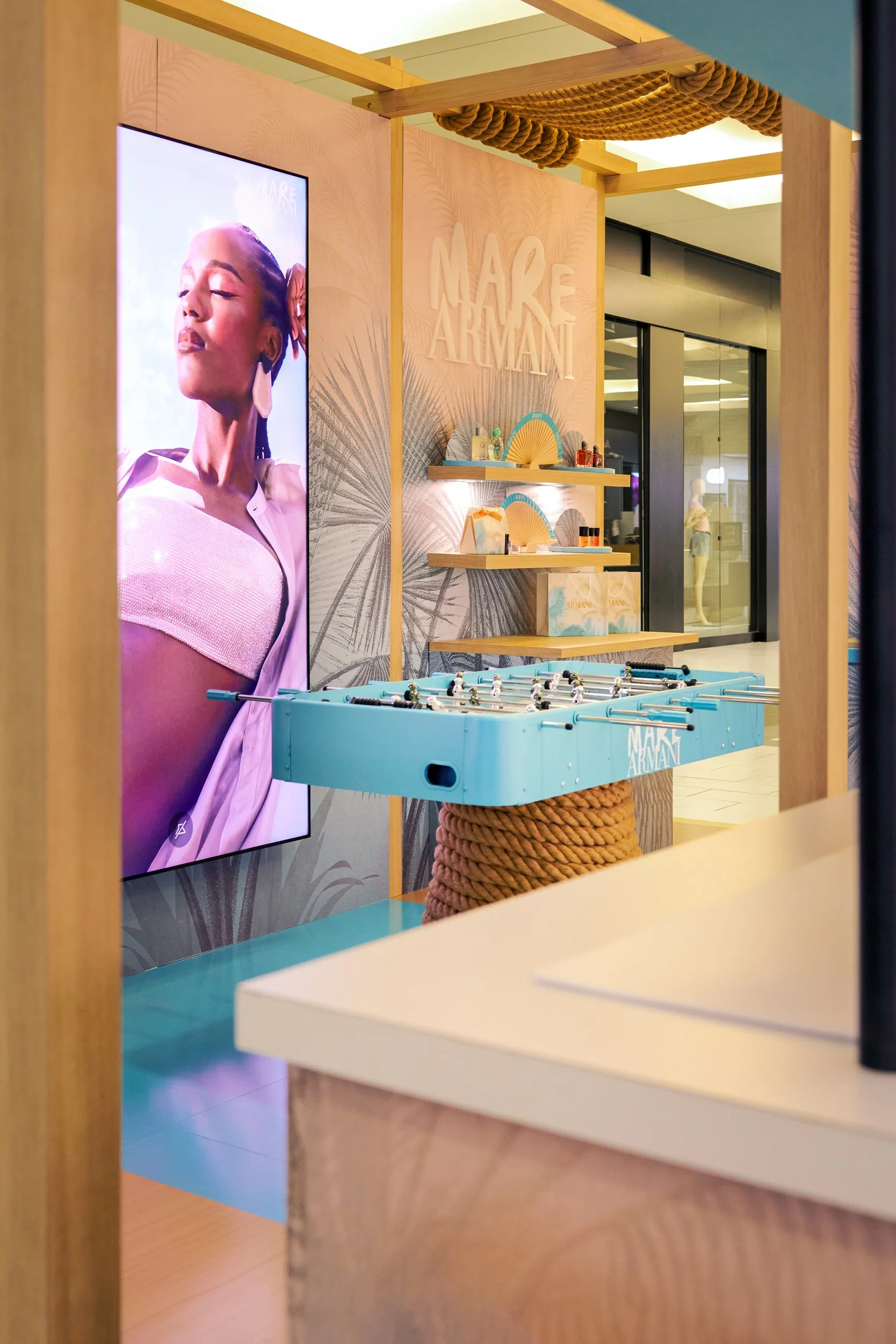 Park’s concept blended natural materials and coastal design cues to evoke a modern beach club aesthetic. Rope-wrapped columns, timber frameworks, pastel surfboards, and branded life buoys layered in storytelling details, while soft palm frond graphics carried the Mare narrative across the space. At the heart of the outpost, a 100” digital screen displayed campaign content, anchoring the activation and drawing shoppers into the world of Armani Beauty. Playful additions like a custom foosball table and popsicle cart added lifestyle touches, while integrated makeup stations and curated product displays invited tactile discovery and interaction.